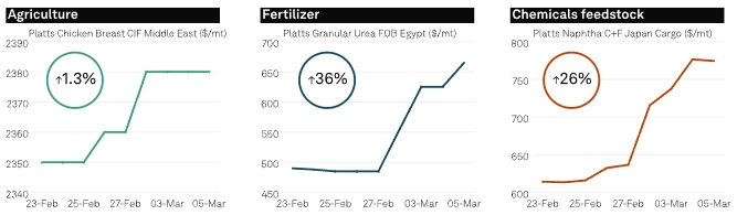 Источник данных: S&P Global Energy. Слева направо: недельный рост цен курицу, на удобрения, на нафту.