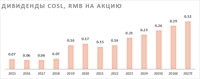 China Oilfield Services стабильно выплачивает нейтральные по меркам сектора дивиденды. Исторически норма выплат составляет около 30%. Полагаем, что в будущем она может сохраниться, а размер дивидендов по итогам 2025 г. может составить RMB 0,26 (HKD 0,294) на акцию, что соответствует доходности 2,6%.