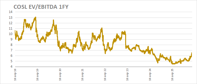 Даже после роста акций форвардная оценка China Oilfield Services выглядит умеренной. Форвардный мультипликатор EV/EBITDA составляет менее 7, что значительно меньше показателей 2018–2023 гг., хотя перспективы роста бизнеса у COSL остаются положительными.