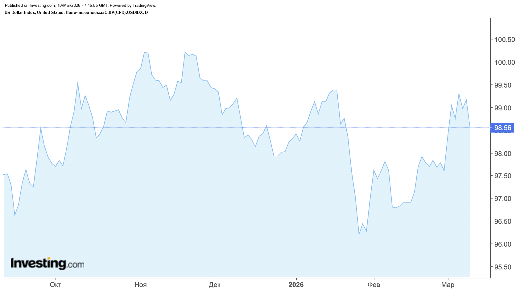 На валютном рынке наблюдалась традиционная для периодов эскалации динамика: инвесторы уходили в защитные активы. Повышенный спрос на доллар привел к росту индекса DXY, который 5 марта поднимался до отметки 109 пунктов.