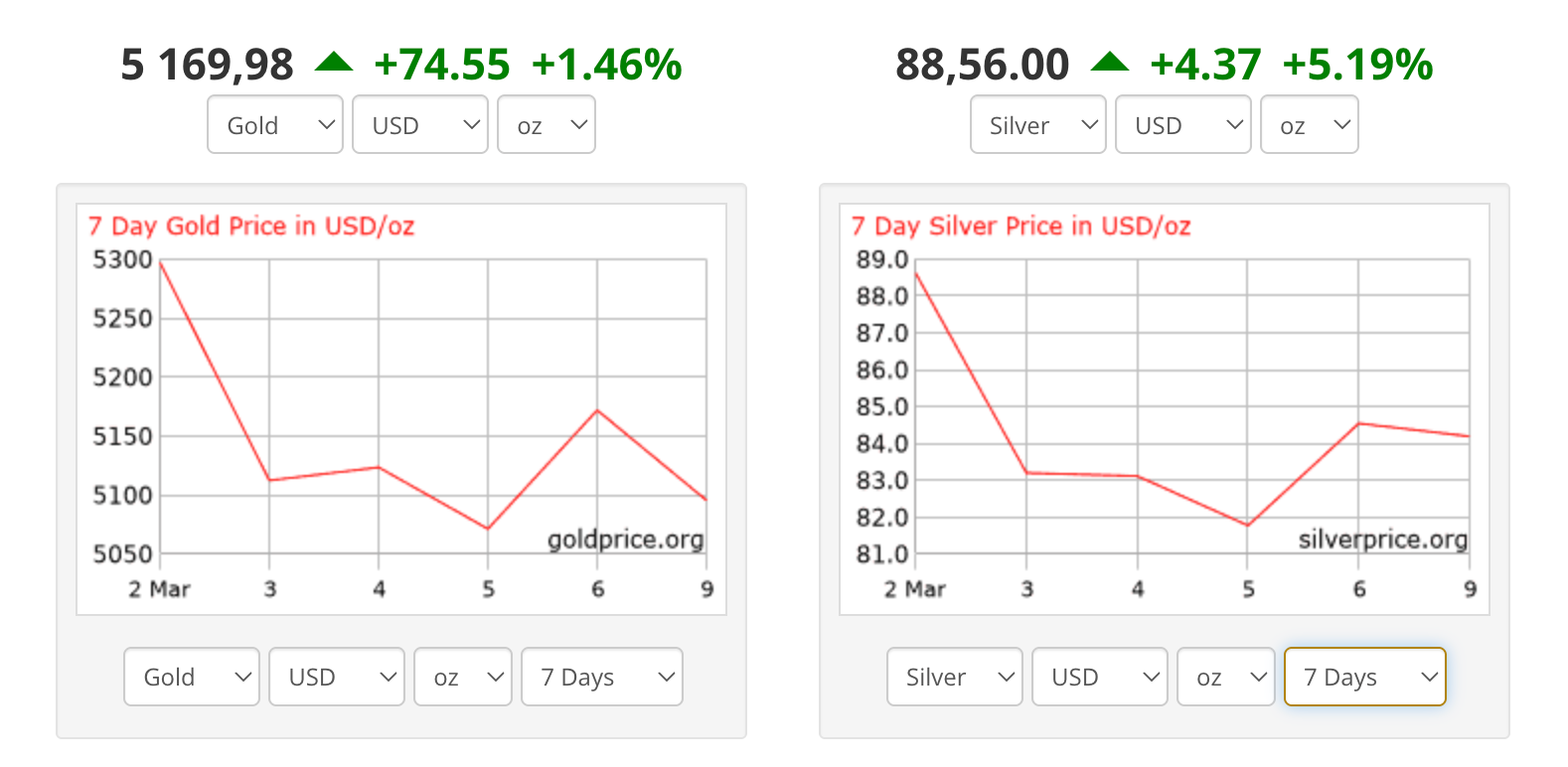 В начале конфликта золото подтвердило статус классического защитного актива. 2 марта спотовая цена поднималась до $5297 за унцию, а фьючерсы закрылись еще выше — около $5312. К моменту написания котировки скорректировались до $5170.