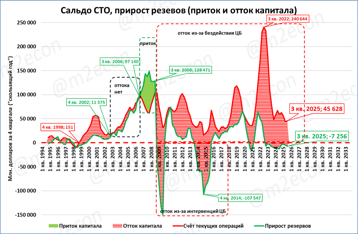 Всё остальное время, увы, ЦБ спал в оглоблях. Подавляющую часть времени он доходы от внешней торговли игнорировал. Они в этом случае автоматически превращаются в отток капитала. Это вся красная зона графика выше нулевой линии.