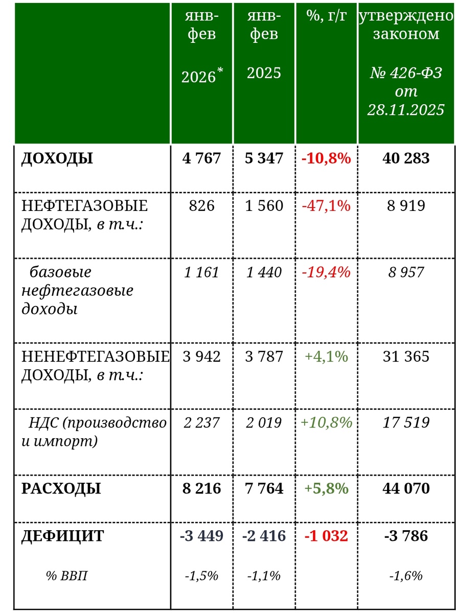 Вышли очередные данные по исполнению бюджета за первые два месяца. Февраль оказался таким же провальным, как и январь. Суммарный дефицит бюджета почти достиг годового плана!