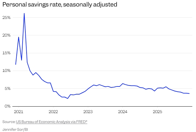 Уровень личных сбережений, который является индикатором потребительского спроса, снизился до 3,6 процента к концу прошлого года, что на 150 базисных пунктов меньше, чем в начале 2025 года.