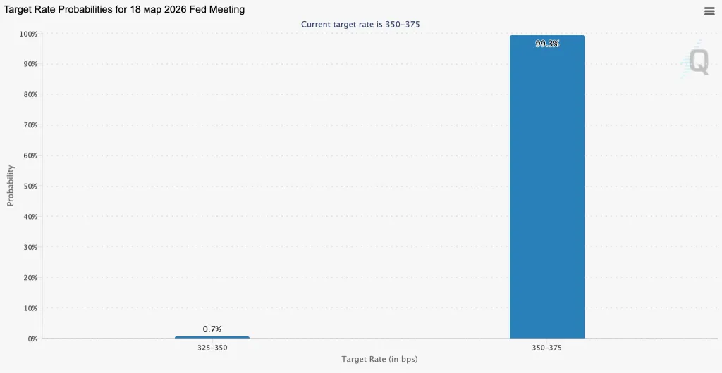 Инвесторы восприняли данные как подтверждение паузы в цикле смягчения денежно-кредитной политики ФРС. Вероятность сохранения текущей ставки на заседании 18 марта составляет 99%. Шансы на снижение в апреле упали до 11%.