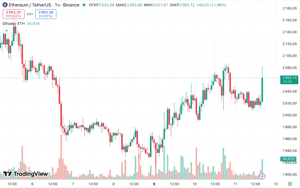 Курс Ethereum поднялся на 2,8% и приблизился к $2100.
