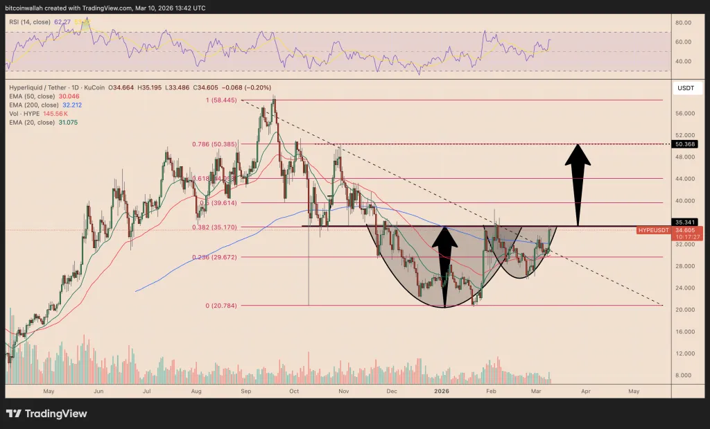 С точки зрения технического анализа на дневном графике HYPE формируется паттерн «чашка с ручкой». Уверенный пробой сопротивления на уровне $35,5 открывает путь к краткосрочной цели в $50.