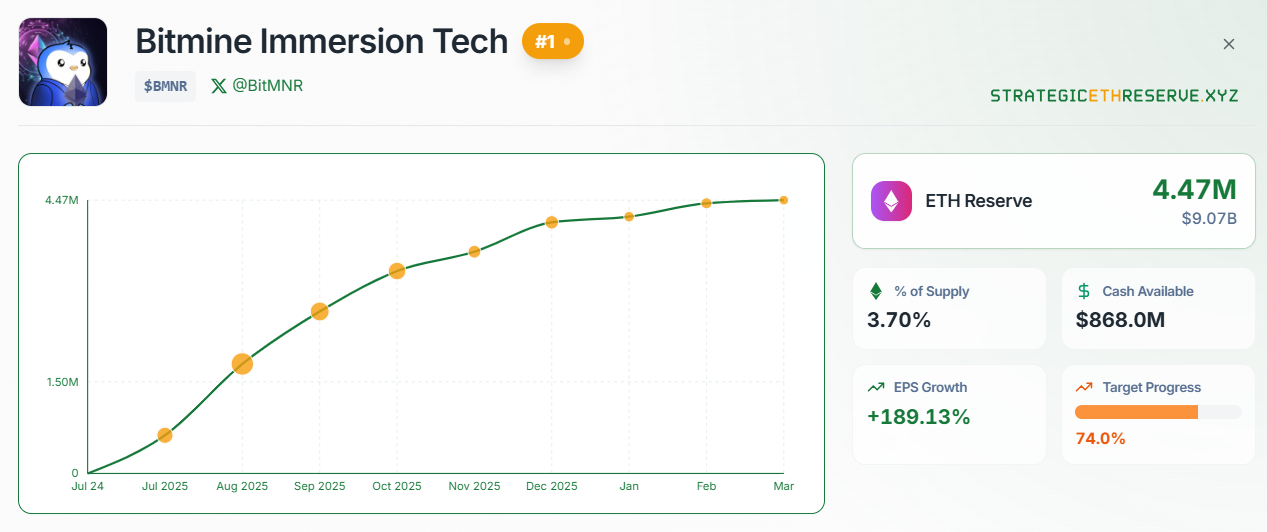 На долю лидера рейтинга — BitMine — приходится 4,47 млн ETH (3,7%). Примечательно, что резервы платформы превосходят запасы Ethereum Foundation более чем в 21 раз.