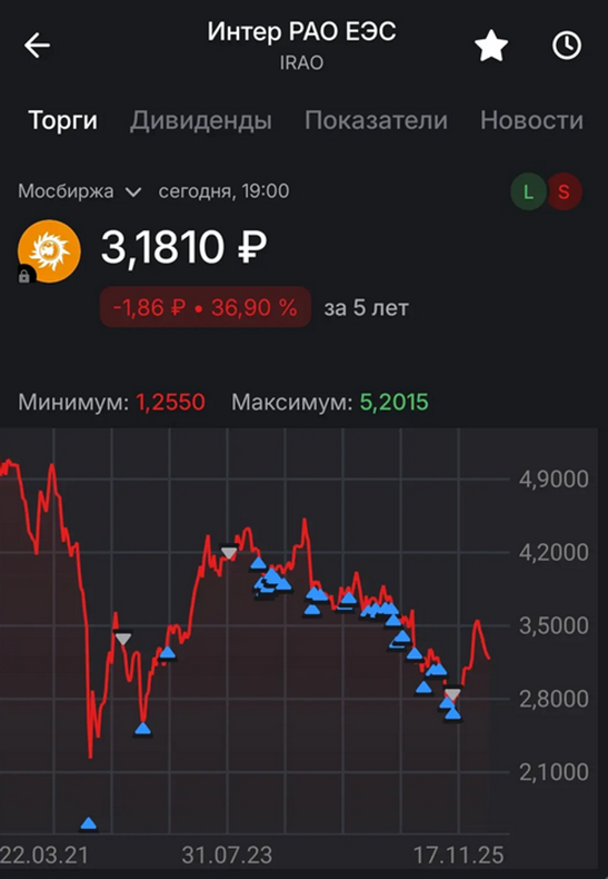 В акциях Интер РАО уже два года наблюдается коррекция, в рамках которой снижение составляет около 30%. За 2025 год динамика -18%, но это не считая дивидендов. С начала 2026 года котировки прибавляют 3%.