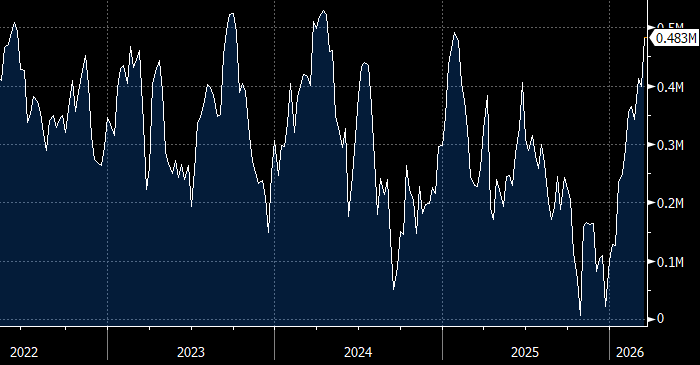Стоит отметить, что в середине декабря чистая длинная позиция крупных спекулянтов в этих инструментах падала почти до нуля, после чего за три месяца выросла в 21,5 раз. Подобное агрессивно-бычье позиционирование создает риски резкого разворота цен на нефть вниз в случае нормализации обстановки в Ормузском проливе или хотя бы появления подобных перспектив.