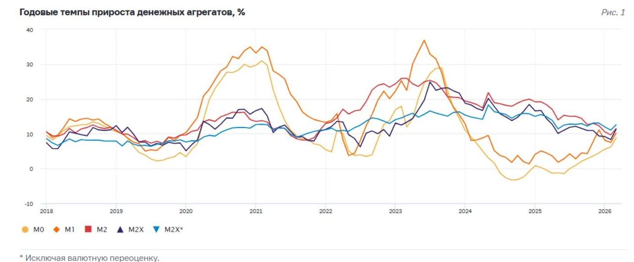 В январе 2026 г, как отмечает Банк России, снижение корпоративного кредитования и сдерживающая динамика бюджетных операций привела к замедлению годового прироста показателей денежной массы (годовые темпы роста денежной массы в национальном определении (М2) и широкой денежной массы (М2Х) по итогам января составили 9,7 и 11,0% после 10,6 и 12,0% в декабре). По итогам февраля ЦБ фиксирует увеличение темпов годового роста денежных агрегатов из‑за сдвига крупных налоговых платежей на первый рабочий день марта, отмечая, что с поправкой на этот сдвиг годовой прирост основных денежных агрегатов был на уровне января.