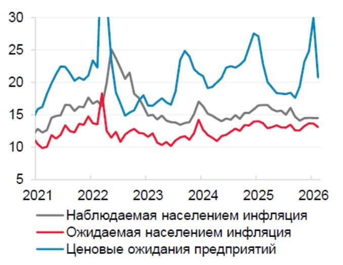 Однако в феврале ценовые ожидания бизнеса заметно снизились – с 30 п. до 20,8 п., что близко к среднему уровню 2025 г. Средний ожидаемый предприятиями прирост цен за ближайшие 3 месяца замедлился с 10,4% до 5,9%, минимум с октября прошлого года. Одновременно очень ослабли оценки бизнес-климата, выпуска и спроса (ниже показателей 3кв25 и очередные минимумы с 2022 г). С ослаблением спроса, по-видимому, и связано снижение ценовых ожиданий предприятий.