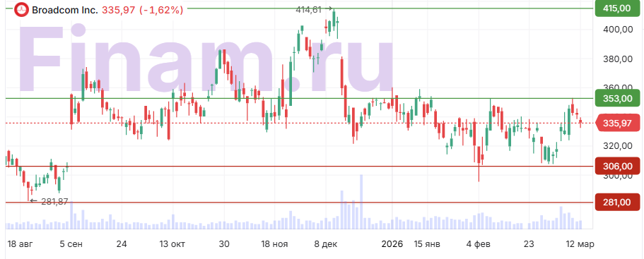 Котировки Broadcom уже несколько месяцев торгуются в боковом диапазоне $306–353. Сейчас акции находятся на уровне $335,9. Закрепление цены выше сопротивления $353 станет сигналом для роста в диапазон $353–415. В то же время пробой поддержки вблизи $306 существенно повысит риск более глубокой коррекции с потенциальной целью в районе $281.