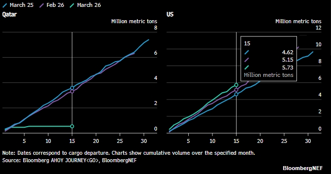 Поставки сжиженного природного газа в США с 1 по 15 марта выросли на 1,1 миллиона метрических тонн в годовом исчислении, в то время как предложение Катара за тот же период сократилась на 3,0 миллиона тонн из-за продолжающегося простоя, вызванного войной. Внутри США, с октября 2025 года, завод Plaquemines работает с превышением своей проектной мощности, еженедельные объемы превышают мощность на 0,12 миллиона тонн. 14 марта Министерство энергетики США разрешило проекту дополнительный экспорт СПГ в страны, не имеющие соглашения о свободной торговле.