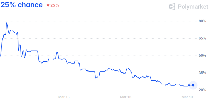 Отметим, что 25% — это область минимальных значений за всю историю существования данного контракта на Polymarket. Так, утром 16 марта вероятность нормализации судоходства через Ормузский пролив к концу апреля оценивалась на платформе в 40%, а вечером 12 марта — выше 50%.