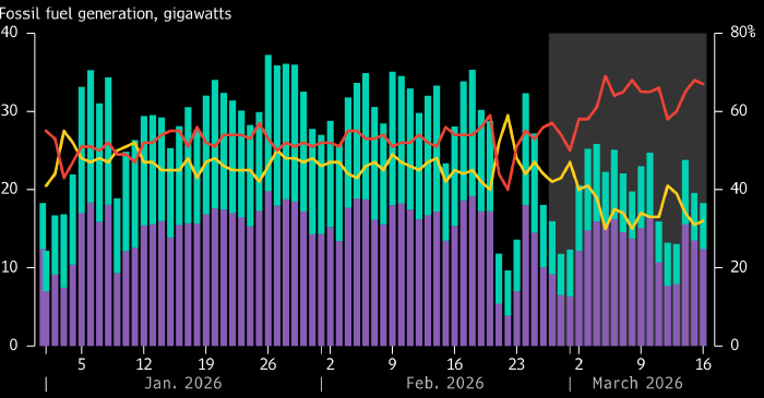 Несмотря на благоприятную экономическую ситуацию, средняя выработка угольных электростанций в первой половине марта снизилась до 13 ГВт по сравнению с 15 ГВт в феврале. Это связано с тем, что снижение спроса на электроэнергию и рост солнечной генерации ограничивают возможности для увеличения угольной генерации.