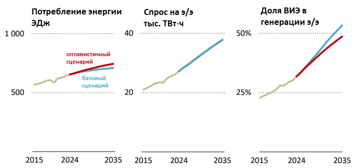 На фоне перебоев с поставками углеводородов, наличия климатических целей и удешевления технологий в сфере солнечной и ветряной генерации МЭА ожидает непрерывного роста мощностей в сфере ВИЭ в ближайшие как минимум 10 лет. По оценкам агентства, даже в достаточно консервативном сценарии к 2035 г. доля ВИЭ (включая гидроэнергетику) в генерации электроэнергии в мире в целом к 2035 г. достигнет почти 50%, хотя сейчас эта доля составляет около трети. При этом мировой спрос на электроэнергию в целом, как прогнозирует МЭА, тоже будет непрерывно расти.