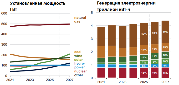 Несмотря на приход Трампа, в США (крупнейший для ETF регион) развитие возобновляемой энергетики продолжилось на фоне ее привлекательности с экономической точки зрения. По оценкам Минэнерго страны, к 2027 г. установленная мощность солнечной генерации обойдет все другие источники, кроме газовой генерации. При этом доля солнечной и ветряной энергетики в генерации электроэнергии может увеличиться с 18% в 2025 г. до 22% в 2027-м.