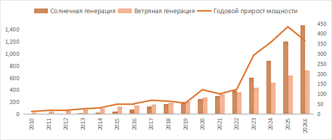 Второй по значимости регион для фонда — Китай, который на данный момент является абсолютным лидером как по существующим мощностям в сфере солнечной и ветряной генерации, так и по ежегодным темпам ввода новых мощностей. В 2025 г. в Китае было установлено 315 ГВт солнечной и 119 ГВт ветряной энергетики. Суммарный прирост мощностей в сфере солнечной и ветряной энергетики впервые в истории смог превысить 400 ГВт, хотя еще в середине прошлого года мы ожидали прироста около 350 ГВт. На Китай пришлось почти 60% от мирового прироста ветровых мощностей и более 50% от мирового прироста солнечных мощностей. Пока что прогнозы на 2026 г. предполагают небольшое снижение темпов ввода: BloombergNEF ожидает ввода 276 ГВт солнечных мощностей, а ввод ветряных мощностей, по прогнозу GWEC, может составить примерно 90 ГВт. При этом отметим, что ранее Китай довольно часто превышал прогнозы.