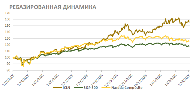 За прошедший год iShares Global Clean Energy ETF смог показать сильную динамику, опередив широкий рынок и технологический сектор. Положительная динамика была связана с низкой базой и высокими темпами ввода мощностей в сфере солнечной и ветряной генерации в Китае, ЕС и США. На наш взгляд, текущие масштабные перебои с поставками углеводородов способны стать стимулом для ряда стран ускорить развитие ВИЭ, которые не зависят от поставок из других регионов. При этом крупнейшие активы фонда сохраняют достаточно умеренную оценку по мультипликаторам, на фоне чего локально мы положительно смотрим на перспективы iShares Global Clean Energy ETF.