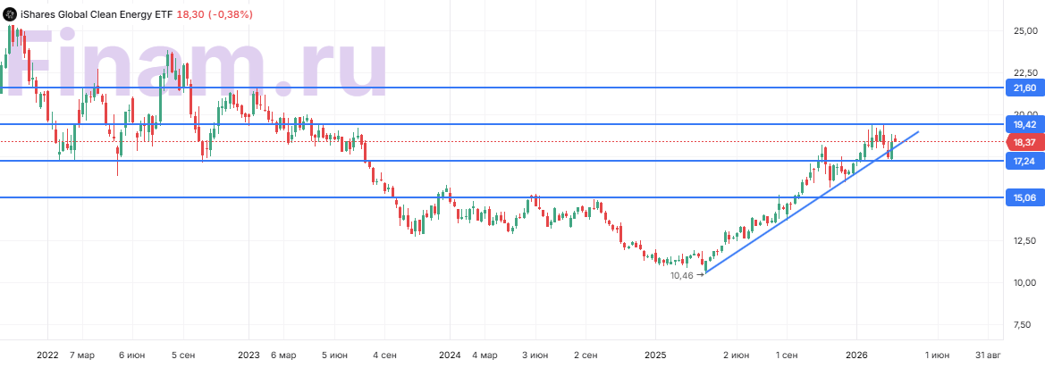 С технической точки зрения на недельном графике iShares Global Clean Energy ETF торгуется в рамках среднесрочного восходящего тренда. Ключевым сопротивлением является уровень $19,4, пробой которого мог бы открыть дорогу для роста до $21,6. При этом в случае слома восходящего тренда первой поддержкой будет выступать уровень $17,2.