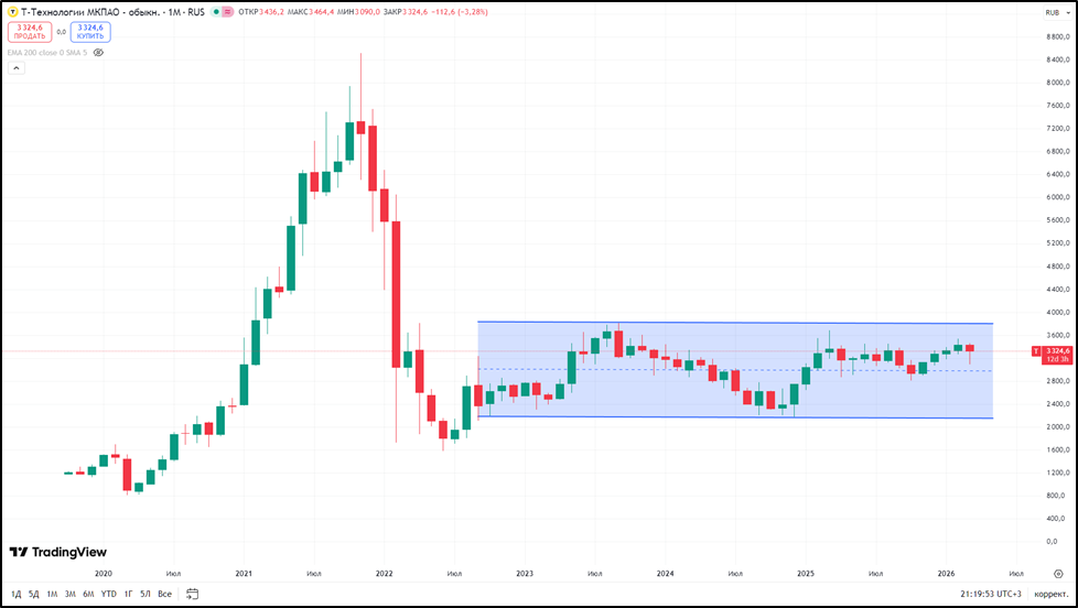 С максимумов 2021 года акции компании упали на 60%. А последние 2,5 года наблюдается боковик. За 2025 год котировки выросли более, чем на 20%, не считая дивидендов. С начала 2026 года динамика околонулевая.