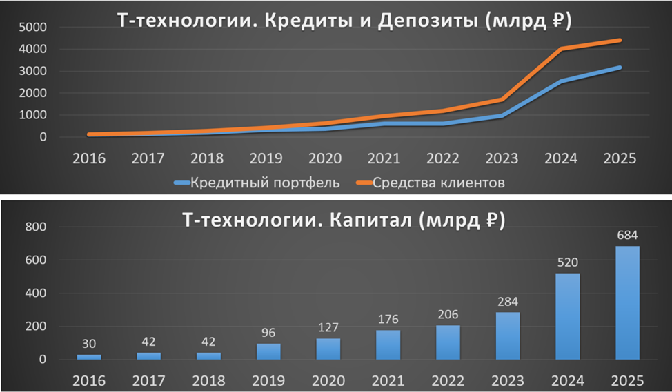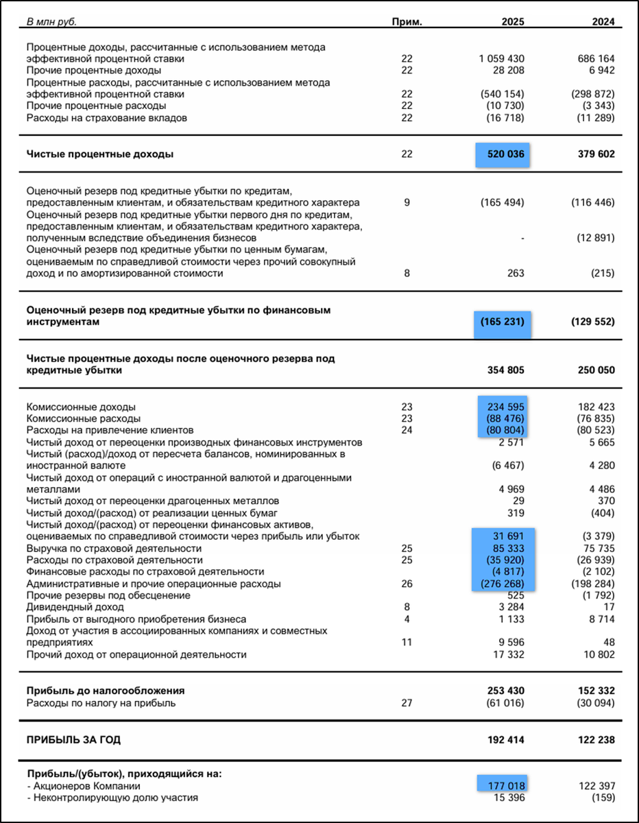 После присоединения Росбанка существенно вырос Капитал Группы. По этой же причине в 2024 году Группа отразила резкий скачок кредитного портфеля и средств клиентов. А за 2025 год кредитный портфель прибавил 25%. Это также очень сильный результат.