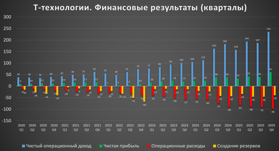 На квартальной диаграмме видно, что все кварталы 2025 года заметно лучше г/г, но это объясняется присоединением Росбанка. Также видно, что результаты последние 1,5 года, после присоединения, в целом стабилизировались. Но именно 2025 4Q получился очень сильным.