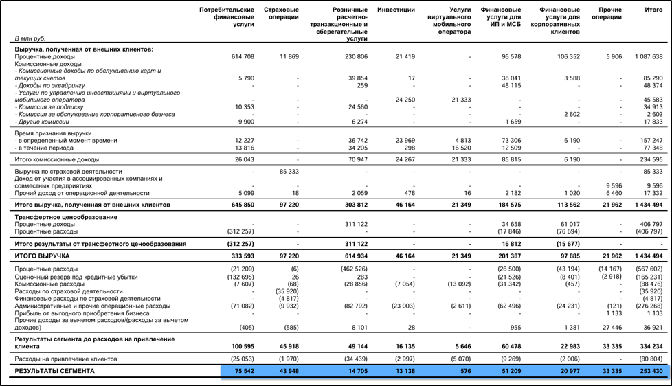 Сегментный анализ показывает, что большую часть прибыли приносят банковские услуги и страхование. Примерно 30% прибыли до налогообложения приходится на розничное кредитование и 28% на финансовые услуги для малого, среднего бизнеса и корпоративных клиентов. Страхование около 17%, «Инвестиции» 5%; мобильные услуги менее 1% прибыли.