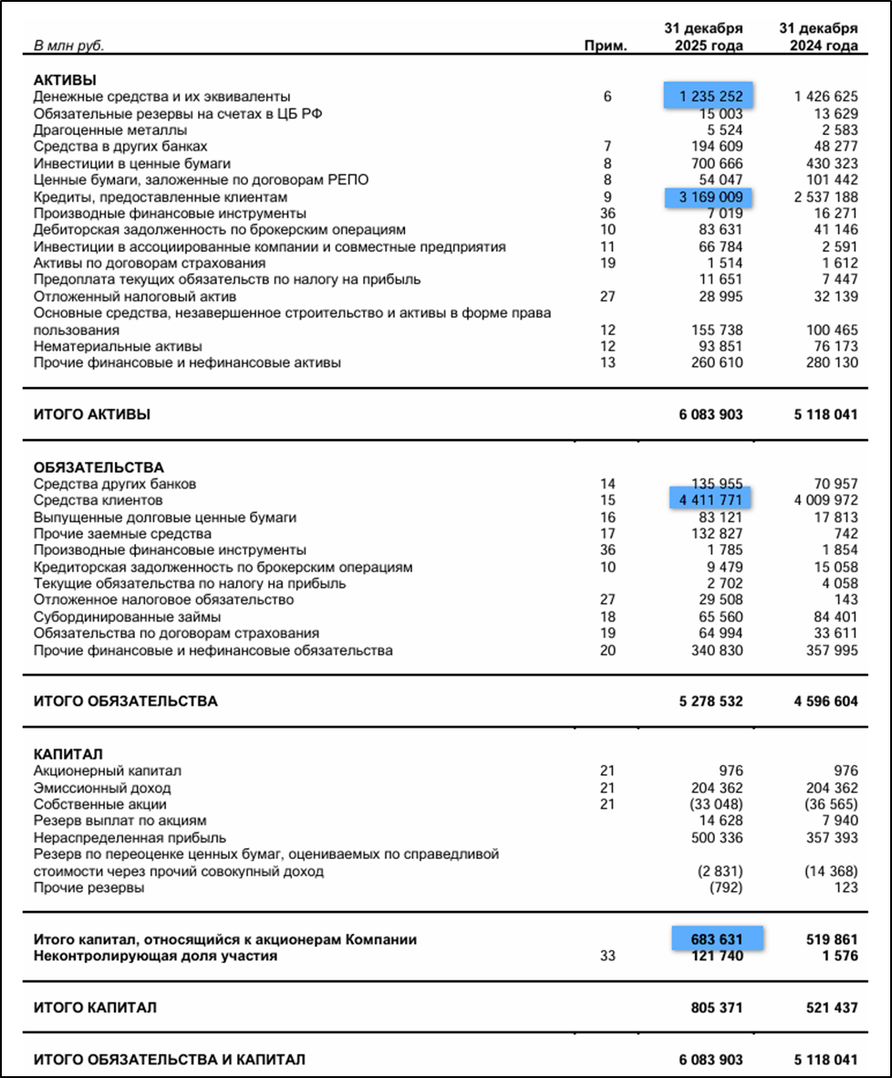 В 2024 году Группа присоединила РОСБАНК, посредством доп эмиссии. Количество акций в обращении увеличилось на 35%. В основном благодаря этому присоединению, операционные и финансовые результаты сильно подросли г/г. Результаты 4Q 2025, как и всего 2025 года, рекордные. Баланс отражает планомерный рост бизнеса.