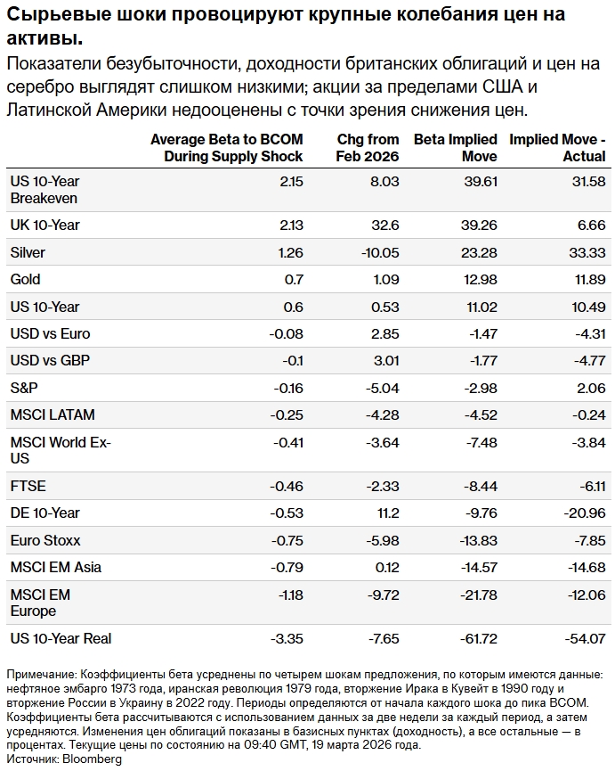 Для оценки ожидаемых рыночных движений в связи с конфликтом в Иране я проанализировал взаимосвязь между ценами на активы и сырьевые товары в период четырех предыдущих шоков предложения сырья. Основываясь на текущем движении индекса Bloomberg Commodity Index, эти коэффициенты бета указывают на значительно большие корректировки, чем те, что уже учтены в текущей цене.
