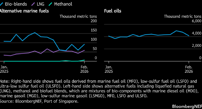 Альтернативные виды топлива завоевывают позиции на бункерном рынке Сингапура на фоне сбоев в поставках мазута в Азию из-за войны вокруг Ирана.