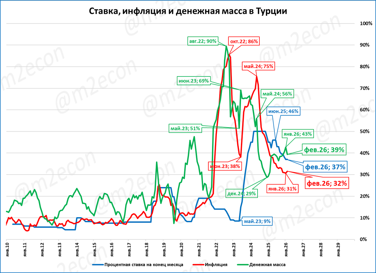 В феврале рост денежной массы Турции составил 39% к февралю 2025 года