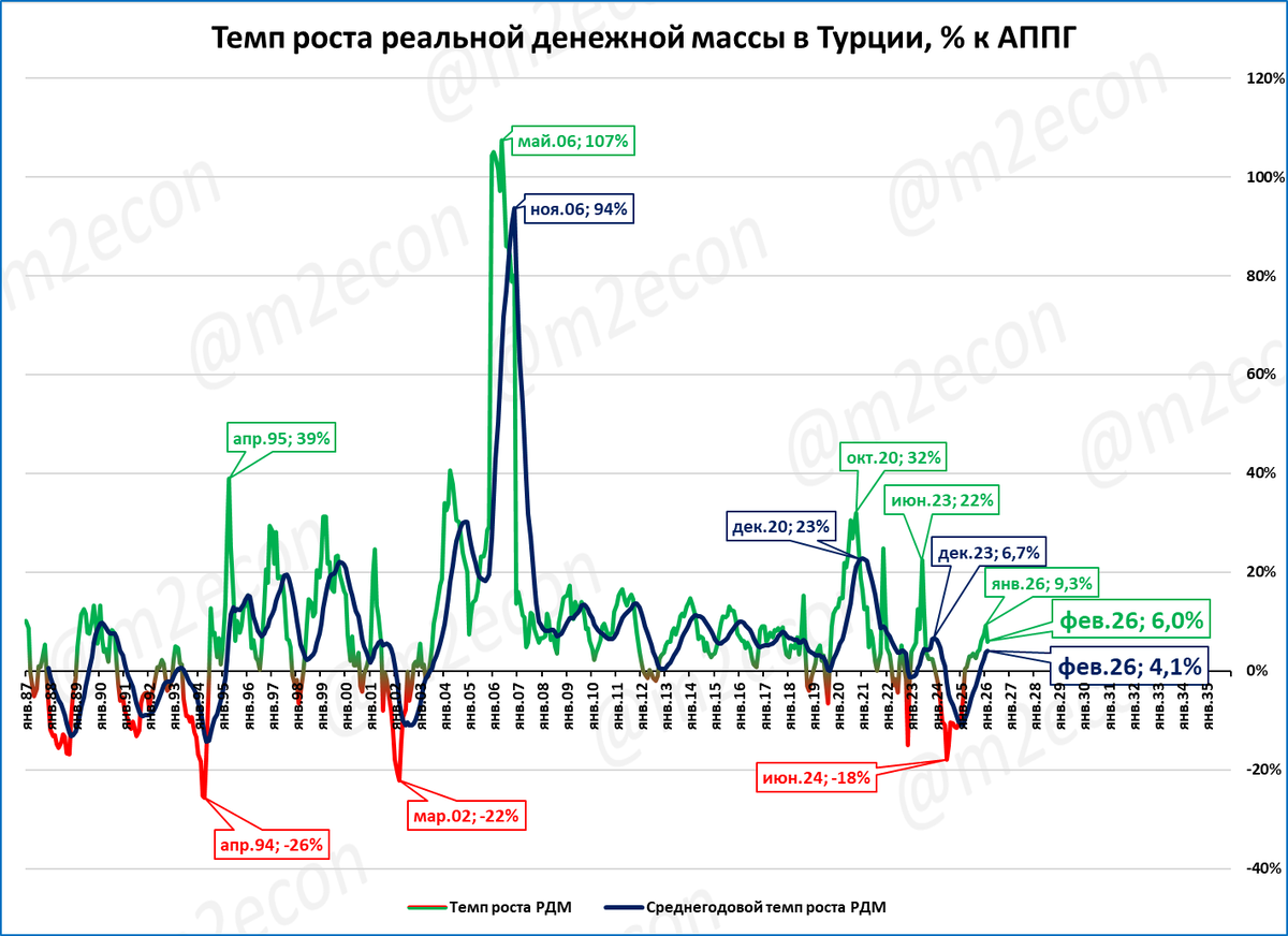 В феврале рост РДМ Турции составил 6,0% к февралю 2025 года. Рост ВВП в 3 квартале составил 3,7% к 3 кварталу 2024 года. Итоги года пока неизвестны.
