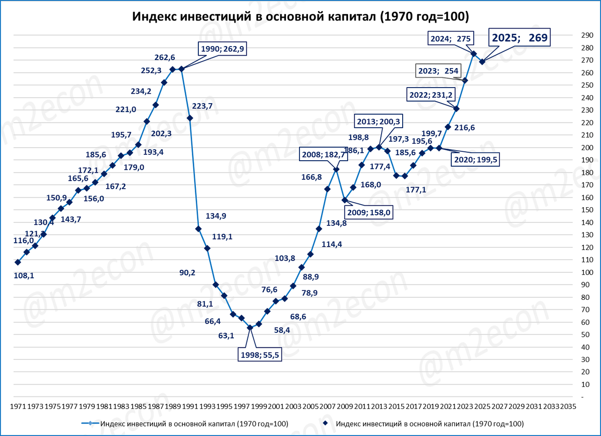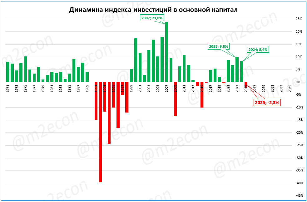 Падение инвестиций явилось прямым следствием замедления роста ВВП с 4,9% в 2024 до 1% в 2025 году. Ведь если спрос не растёт, то для его удовлетворения, как правило, достаточно ранее сделанных инвестиций.
