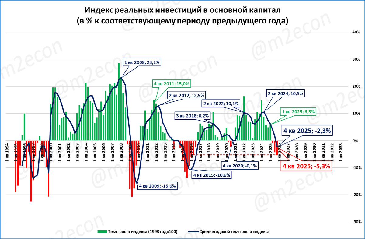 В 4 квартале инвестиции в основной капитал упали, -5,3%. Несмотря на падение, в 2025 году был показан второй лучший результат в истории по объёму инвестиций.