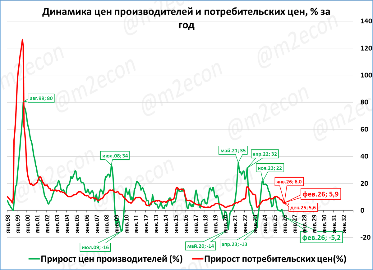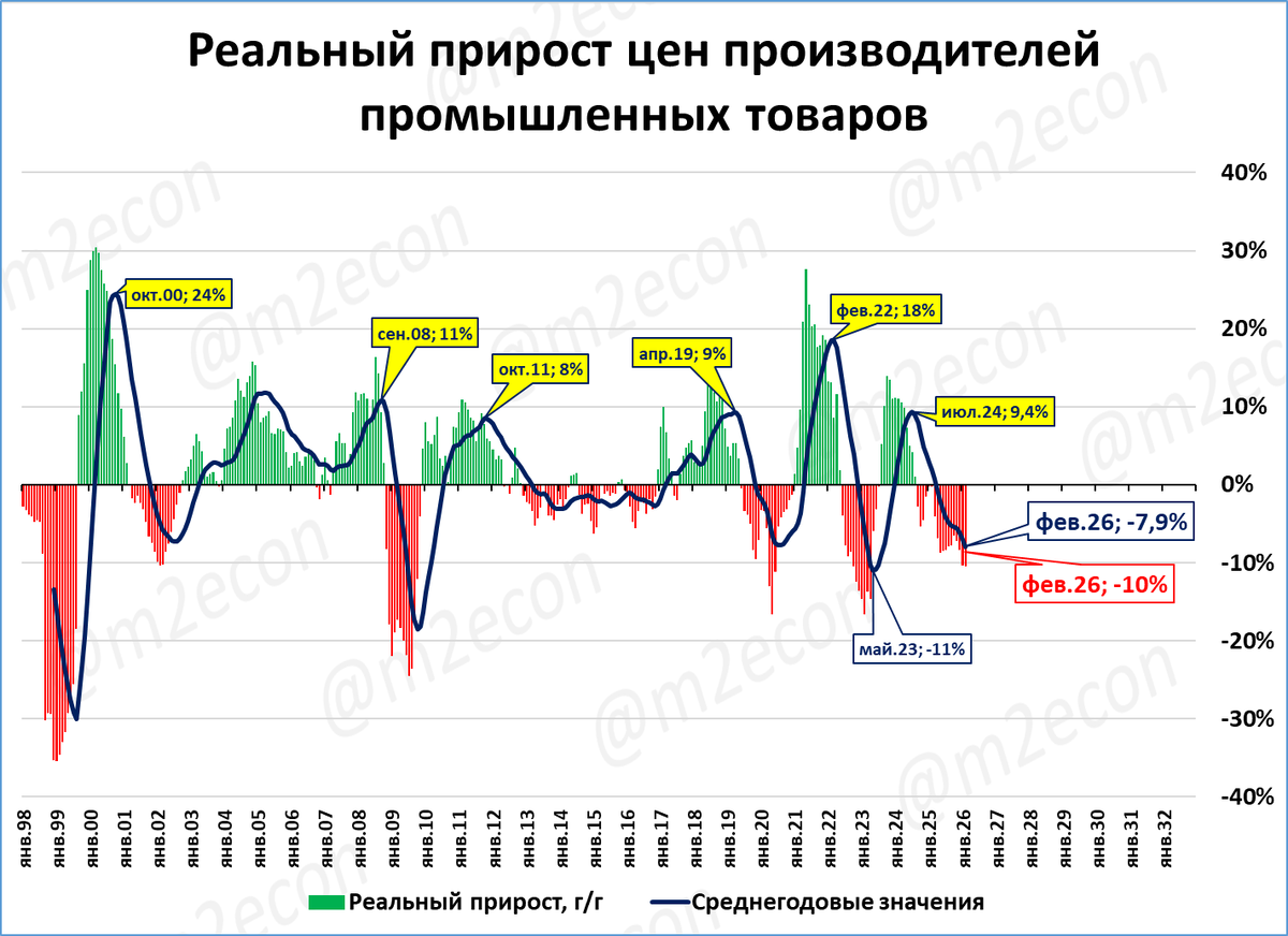 Цены производителей по итогам февраля снизились: -5,2% к февралю 2025 года. Они отстают от роста потребительских цен (+5,9%). В реальном выражении цены производителей падают ещё сильнее, -10%. Это негативный сигнал, и он усиливается.
