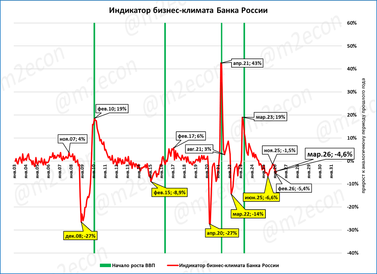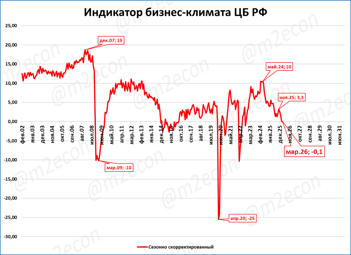 Он опустился в отрицательную зону впервые с 2022 года. Напомним, что выше приведён используемый Центробанком сезонно-сглаженный ряд.
