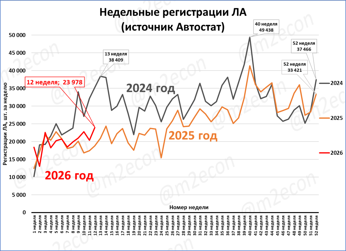 По данным агентства «Автостат», регистрации легковых автомобилей на 12 неделе составили 24 тыс. шт.