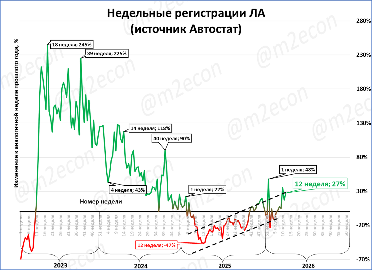 Темпы опять вписываются в коридор улучшающейся динамики (пунктиры на графике). Динамика вышла в уверенный плюс.