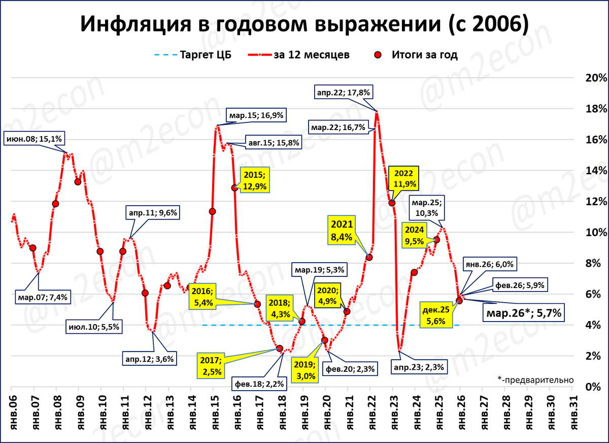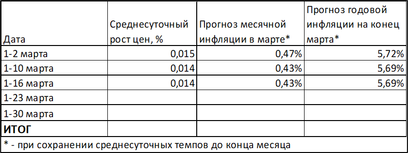Если такой темп сохранится до конца месяца, то по итогам марта инфляция снизится до 5,69% годовых (по итогам февраля 5,91%).