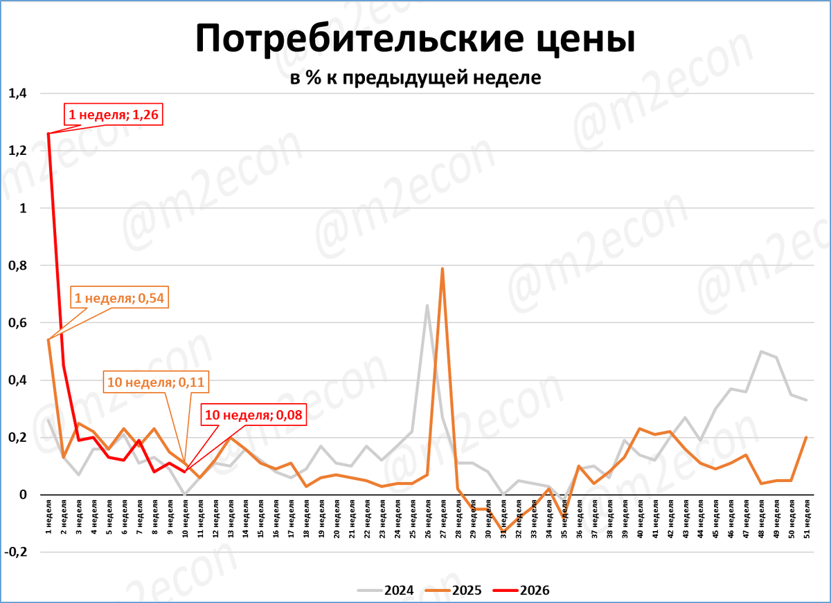 Недельный рост цен (0,08% за 10 неделю) ниже, чем в прошлом году (0,11% за 10 неделю 2025 года).