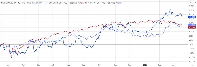За последние 12 месяцев котировки NextEra Energy показали более сильную динамику, чем электроэнергетическая отрасль и широкий рынок США в целом. Стоимость акций компании выросла на 25,9%, в то время как S&P 500 Utilities вырос на 18,3%, а S&P 500 увеличился на 17,6%. На графике видно, что ралли в акциях NextEra Energy началось с января на фоне роста интереса инвесторов к компании на фоне увеличения спроса на электроэнергию со стороны дата-центров и новостей о стратегических сделках по расширению присутствия в газовом сегменте и в целом повышенный спрос на защитные секторы на фоне геополитической напряженности на Ближнем Востоке. Однако уже в марте котировки скорректировались под давлением сохраняющихся высоких процентных ставок, а также опасений инвесторов, связанных с переходом компании в фазу повышенной инвестиционной нагрузки.