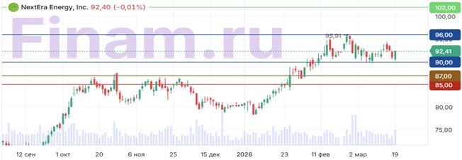 С точки зрения технического анализа котировки NextEra Energy после сильного роста в начале года достигли исторического максимума в районе $95,9, после чего перешли к боковой динамике в диапазоне $90–96 и находятся на уровне $92,4. Пока бумаги остаются внутри этого диапазона, техническая картина не дает убедительных сигналов в пользу направленного движения. Пробой уровня отметки $96 станет сигналом для роста в диапазон $96–102, тогда как снижение ниже $90 станет негативным сигналом и укажет на повышение риска более глубокой коррекции в диапазон $85–87.