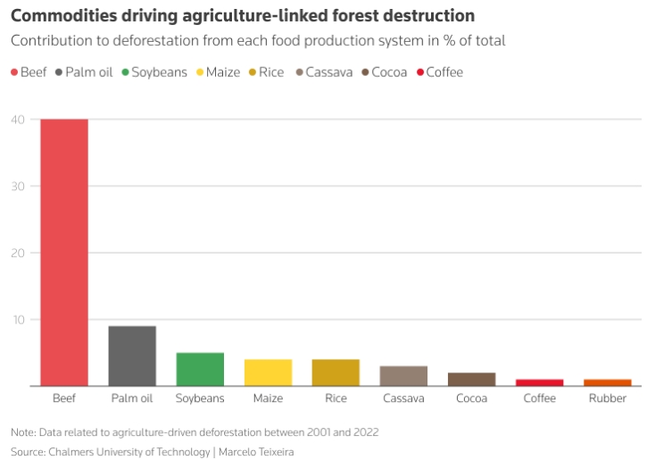 Производство говядины стало ключевой причиной обезлесения, связанного с сельским хозяйством. По данным исследования, опубликованного во вторник, на его долю приходится 40% всех случаев вырубки лесов для расширения сельскохозяйственных угодий.