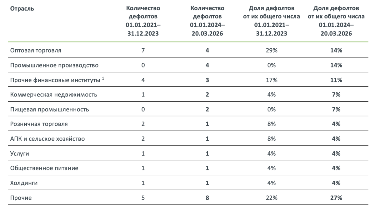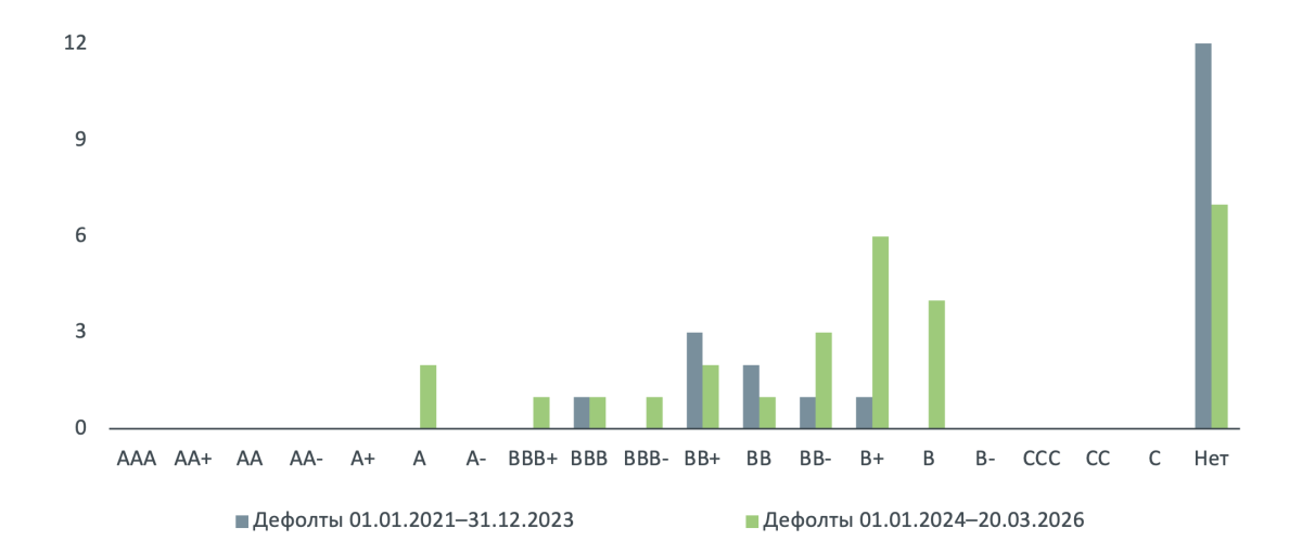 По мнению АКРА, в целом структура российского облигационного рынка с заметной долей эмитентов высокодоходных облигаций в общем объеме эмитентов долговых обязательств сложилась к началу 2021 года. По подсчетам агентства, с 01.01.2021 по 20.03.2026 было зафиксировано более 50 дефолтов, которые были разбиты на две группы:
