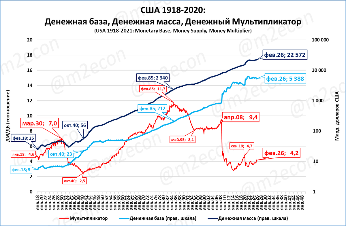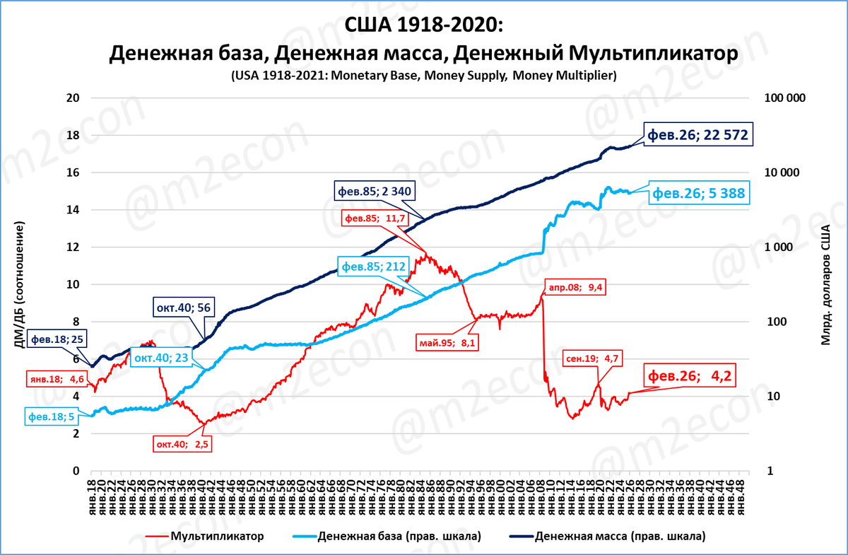 С 1918 по 2026 год денежный мультипликатор не вырос, а снизился (с 4,6 в 1918 годо до 4,2 в 2026 году). Повторяем график для удобства.