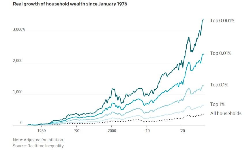 Очень богатых людей стало больше во многом потому, что их состояние росло намного быстрее, чем у всех остальных. Даже с поправкой на инфляцию благосостояние 0,1% самых богатых домохозяйств за последние 50 лет выросло более чем в 13 раз, согласно данным Realtime Inequality, индикатора, разработанного экономистами Эммануэлем Саезом (Калифорнийский университет в Беркли) и Габриэлем Цукманом (Парижская школа экономики). Согласно этому анализу, американские семьи с чистым капиталом в 43 млн долларов и выше в 2024 году вошли в число 0,1% самых богатых.