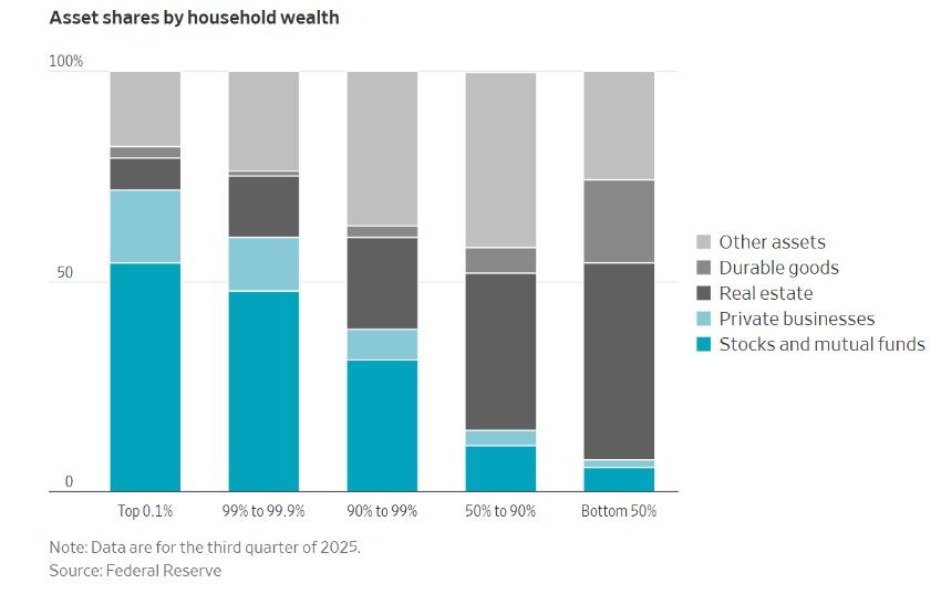 По данным ФРС, у 0,1% самых состоятельных людей почти 72% их состояния составляют корпоративные акции, паи взаимных фондов и частного бизнеса. За последнее десятилетие индекс S&P 500 вырос более чем втрое. Кроме того, стоимость акций многих частных компаний также выросла.