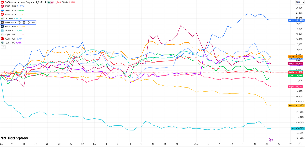 Динамика российских акций потребительского сектора и Индекса МосБиржи с начала 2026 года